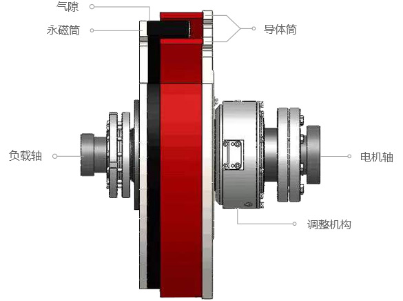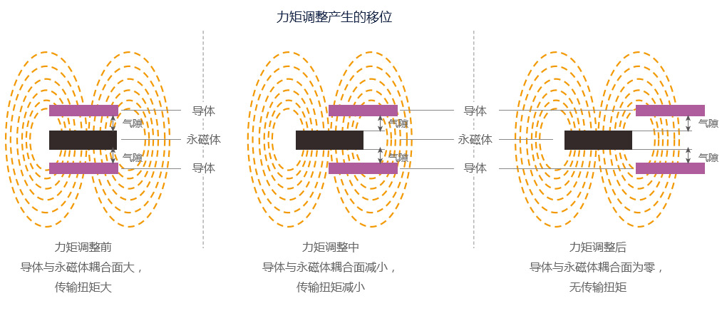 永磁調(diào)速器扭矩傳遞原理和耦合器相同,在耦合器基礎(chǔ)上增加了調(diào)速機(jī)構(gòu),通過電動(dòng)執(zhí)行器,可以調(diào)節(jié)導(dǎo)體和永磁體的有效耦合面積,改變兩者之間傳遞的扭矩大小,實(shí)現(xiàn)可調(diào)節(jié)、可控制的扭矩輸出,達(dá)到負(fù)載調(diào)速和節(jié)能的目的。