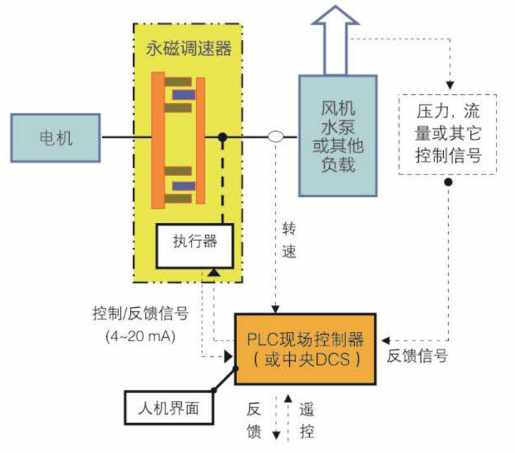 斯普瑞永磁調(diào)速器匹配技術(shù)成熟的電動(dòng)執(zhí)行器控制調(diào)速機(jī)構(gòu),接收DCS或PLC提供的標(biāo)準(zhǔn)4—20mA控制信號(hào),實(shí)時(shí)調(diào)節(jié)導(dǎo)體轉(zhuǎn)子與永磁轉(zhuǎn)子間的耦合面積,實(shí)現(xiàn)在線調(diào)節(jié)負(fù)載轉(zhuǎn)速的功能。